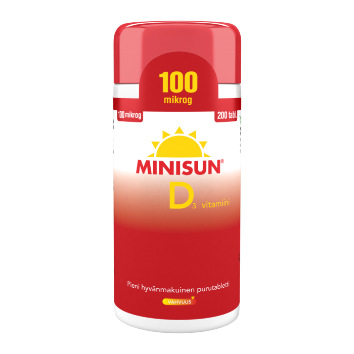 En liten, välsmakande tuggtablett. D3-vitaminpreparat. Innehåller lättupptagligt D3-vitamin och tabletterna är lätta att dosera. En tuggtablett om dagen räcker. Dosering: För vuxna och barn över 10 år: 1 tablett dagligen: 1 tuggtablett dagligen. Tabletten kan tuggas, sugas eller sväljas. Innehåll: En tablett innehåller: D3-vitamin (kolekalciferol) 100 mikrog (4000 IU), 2000 % av referensvärdet. Förteckning över ingredienser: Sötningsmedel (sorbitol, xylitol), klumpförebyggande medel (magnesiumsalter av fettsyror), D3-vitamin (kolekalciferol). Innehåller sötningsmedel. Överdriven konsumtion kan ha laxerande verkan. Gluten-, laktos-, mjölk-, soja- och gelatinfri. Bör observeras: Ersätter inte en balanserad och mångsidig kost eller en hälsosam livsstil. Doseringen får ej överskridas. Förvaras oåtkomligt för barn. Förvaras skyddad från ljus och fukt. Rekommenderas inte för barn under 11 år.