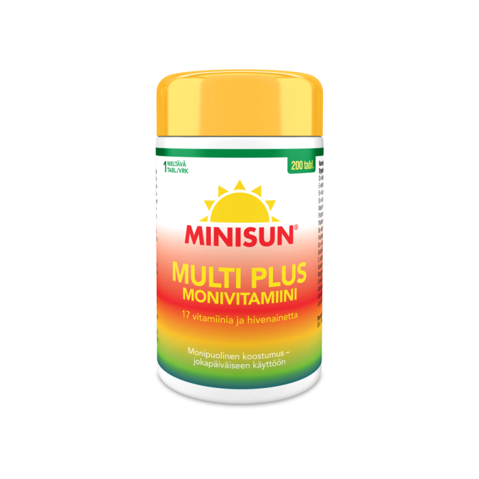 Minisun monivitamiinit ovat helppo tapa turvata päivittäinen vitamiinien ja hivenaineiden saanti ympäri vuoden. Monipuolinen Minisun Monivitamiini Daily on suomalaisille suunniteltu monivitamiinivalmiste, joka sisältää jopa 17 eri vitamiinia ja hivenainetta. Minisun Monivitamiini Daily sisältää erityisesti vastustuskyvylle tärkeitä D- ja C-vitamiinia sekä luuston terveydelle tärkeää kalsiumia. Minisun Monivitamiini Daily on helposti nieltävä tabletti, joka sopii koko perheelle. 1 tabletti päivässä riittää. Tuote on laktoositon, gluteeniton, soijaton, hiivaton ja liivatteeton.