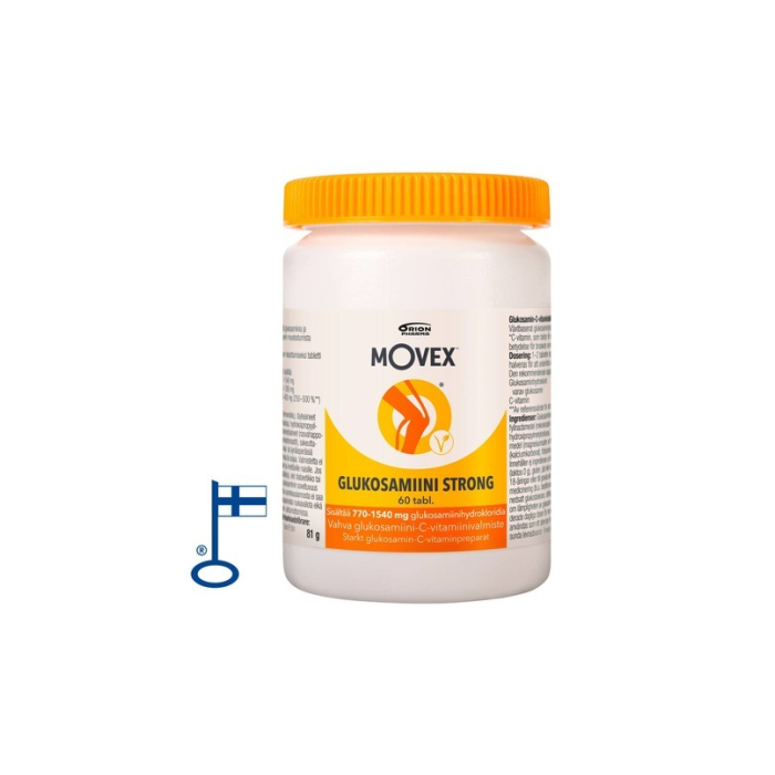Movex Glukosamiini Strong är ett starkt och helt växtbaserad (fermenterad) glukosamin-C-vitaminpreparat för ledernas välbefinnande*. Nyckelflaggaprodukt är lämplig för veganer. *C-vitamin bidrar till normal kollagenbildning som har betydelse för broskets normala funktion.