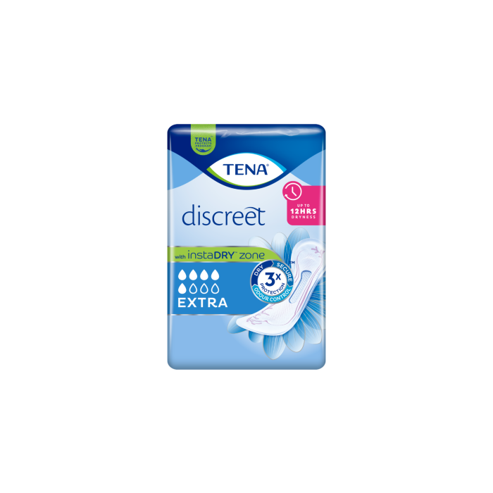 Erittäin varma TENA Discreet Extra -inkontinenssisuoja sopii täydellisesti keskivaikeaan, odottamattomaan virtsankarkailuun. instaDRY™-ominaisuuden ansiosta neste imeytyy välittömästi, ja erittäin imukykyinen ydinosa lukitsee sen syvälle suojan sisään pois iholta varmistaen, että olo pysyy kuivana pitkään – jopa 12 tunnin ajan. TENA Discreet Extra antaa kolmitehoisen suojan ohivuotoja, hajuja ja kosteaa tunnetta vastaan. Se onkin ehdottomasti paras valinta päivittäiseen keskivaikeaan virtsankarkailuun. Tämä pehmeä inkontinenssisuoja tuntuu käytössä mukavalta: joustavien sivujen ansiosta suoja myötäilee kehon muotoja. Voit tuntea olosi varmaksi jokaisessa tilanteessa. Hyvin istuva suoja toimii välittömästi, kun odottamaton virtsankarkailu yllättää.